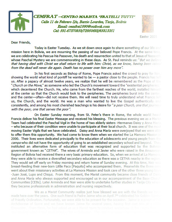Fr Hoppy's letterNews from Misioneros Maristas, Bolivia |