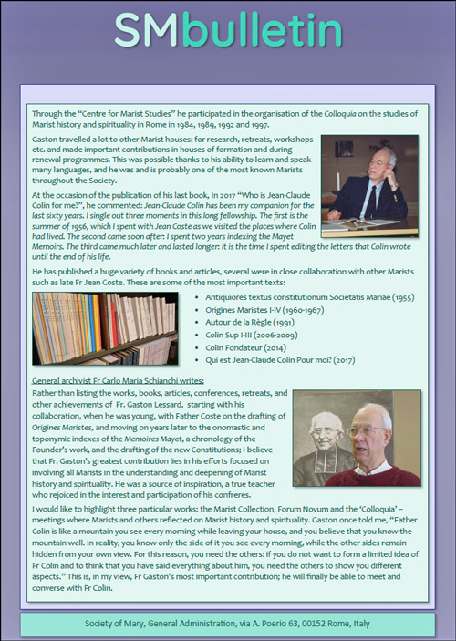 From the General House of the Society of Mary, Rome, comes a special edition of SM Bulletin, a tribute to Fr Gaston Lessard SM who died on Mar 28. May he rest in peace.